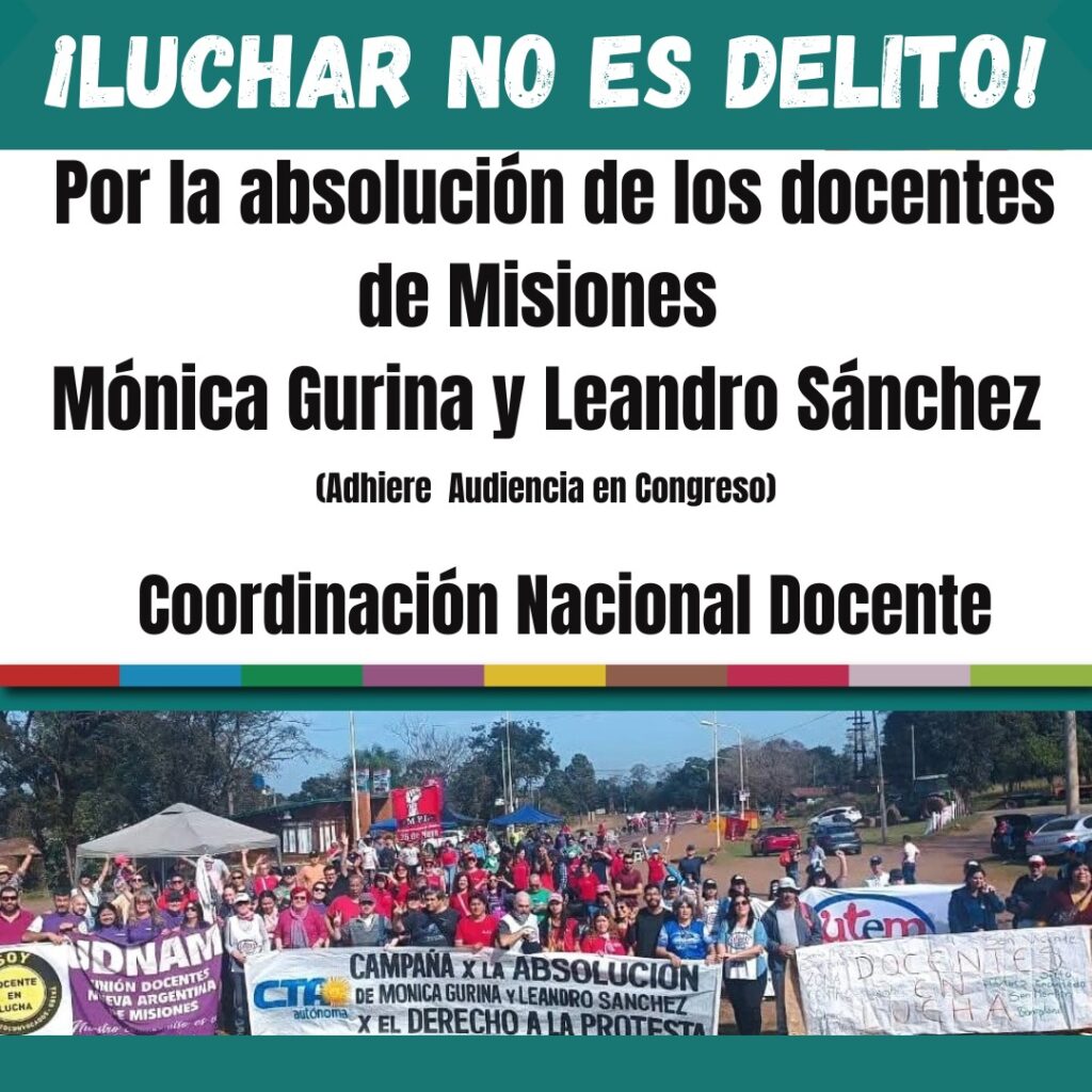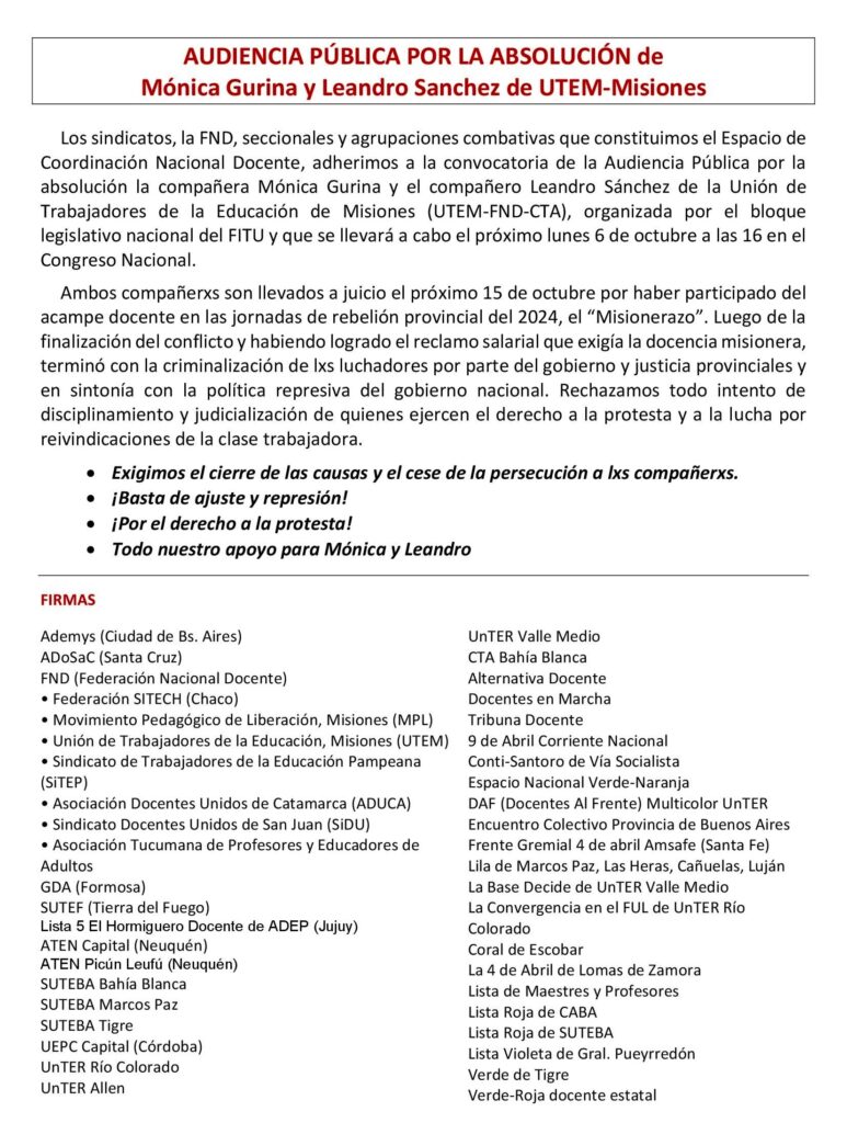 Los sindicatos, la FND, seccionales y agrupaciones combativas que constituimos el Espacio de Coordinación Nacional Docente, adherimos a la convocatoria de la Audiencia Pública por la absolución la compañera Mónica Gurina y el compañero Leandro Sánchez de la Unión de Trabajadores de la Educación de Misiones (UTEM-FND-CTA), organizada por el bloque legislativo nacional del FITU y que se llevará a cabo el próximo lunes 6 de octubre a las 16 en el Congreso Nacional.