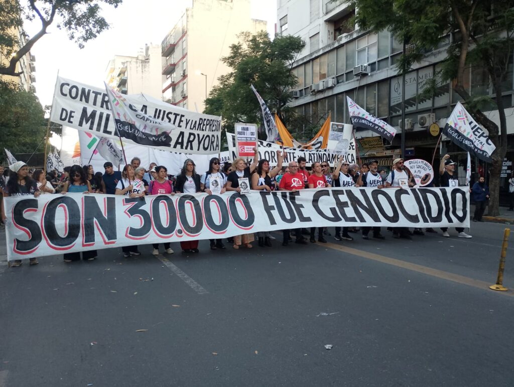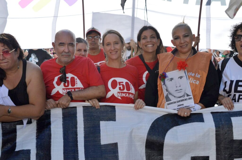 Además, sumamos nuestras denuncias y reclamos al gobierno cómplice de Llaryora en el documento unitario elaborado por el Encuentro Memoria Verdad y Justicia y la Mesa de Organismos, leído en Plaza de Mayo y en el comienzo de la marcha en Córdoba también.Allí dijimos: “En nuestra provincia todo este plan tiene un cómplice y un ejecutor claro y es el gobierno de Llaryora. Que no solo aportó a Milei, cada vez que lo necesitó, los votos para avanzar con las medidas más reaccionarias como la ley bases, la ley penal juvenil o la reforma laboral esclavista, sino que copia el modelo nacional en los aspectos más regresivos como lo hizo aprobando un RIGI propio, más entreguista incluso que el nacional. Con el endeudamiento externo masivo de nuestra provincia y con un recrudecimiento de la represión y la persecución, siendo precursor de las causas a los que luchan, como pasó con los compañeros imputados por movilizarse exigiendo comida para los comedores. No casualmente fue la policía de Quinteros y Llaryora la que nos reprimió violentamente en el Puente Centenario a las organizaciones que nos movilizamos contra la votación de la Reforma Laboral en Diputados. (…)”