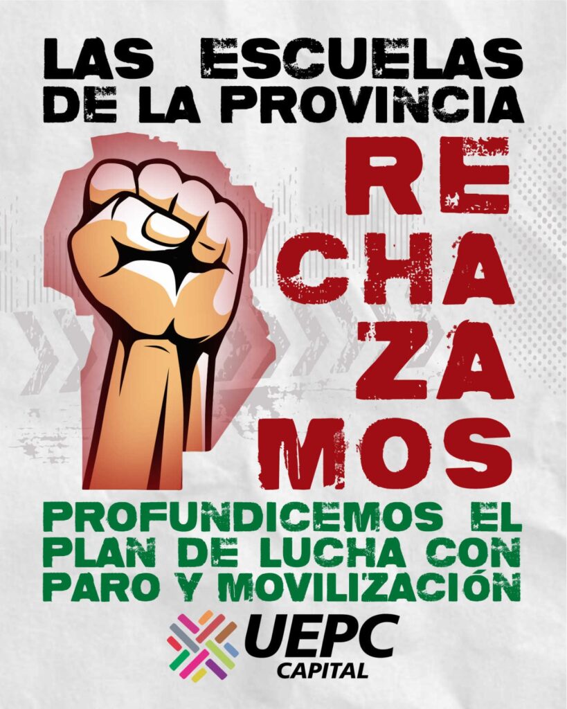 La asamblea departamental votó un paro de 72 horas para miércoles, jueves y viernes de la semana próxima, profundizando el plan de lucha frente a la insuficiente oferta salarial. Desde UEPC Capital se había impulsado una propuesta de paro para lunes, martes y miércoles, buscando no dilatar las medidas, pero la resolución final mantuvo la continuidad de la lucha con una medida extendida.