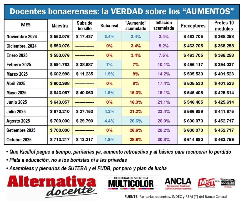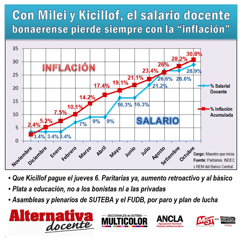 Ante la miseria salarial, reclamamos también que llamen a paritarias ya, por un inmediato aumento salarial retroactivo y al básico para recuperar lo perdido (ver gráfico). Desde Alternativa Docente decimos que plata hay y debe ir a educación no a los bonistas ni a los colegios privados. Y exigimos asambleas y plenarios de SUTEBA y el FUDB, por un paro y plan de lucha.