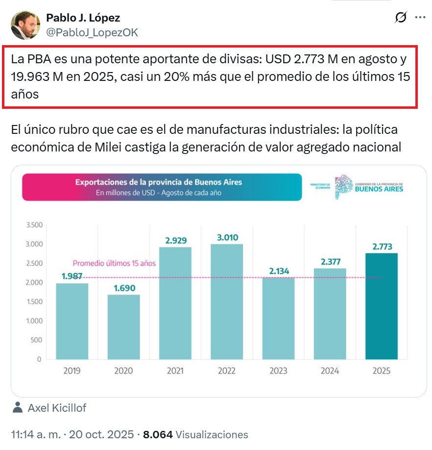 Y si en vez de tanto relato, el PJ pone un impuesto real y progresivo a la riqueza en la Provincia. Ya que el ministro de Economía, Pablo López, reconoce que “la Provincia es una potente aportante de divisas” con exportaciones por 19.963 millones de dólares acumuladas en 2025, un 20% más que en el promedio de los últimos 15 años.