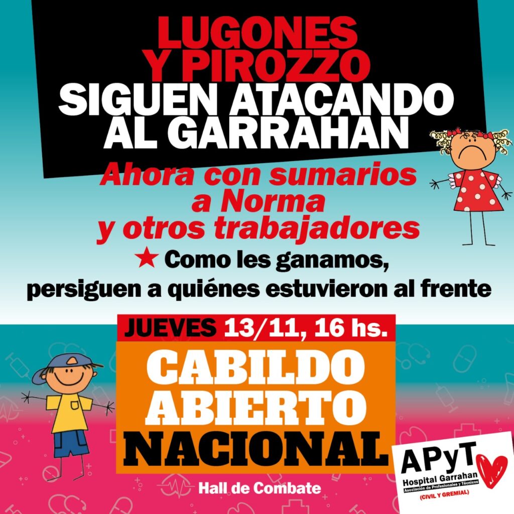 Los trabajadores del equipo de salud del Hospital Garrahan, encabezados por la Asociación de Profesionales y Técnicos (APyT) denunciaron una gravísima situación en dicha institución. Después de recibir el 61 % de aumento salarial tras meses y meses de reclamo, el interventor designado por el ministro Lugones en el hospital, acaba de aplicar sumarios a Norma Lezana y otros trabajadores acusándolos de “coacción, resistencia a la autoridad y usurpación” (sic) por las protestas realizadas en el hospital. Este personaje, llamado Mariano Pirozzo, formado en la universidad privada Maimónides, que no es pediatra, que tuvo entrenamiento en el hospital militar “Cosme Argerich”, que nunca aceptó recibir a los representantes de la APyT y las demás organizaciones que estuvieron al frente del reclamo ahora pretende sancionar e incluso despedir a Norma y otros profesionales.