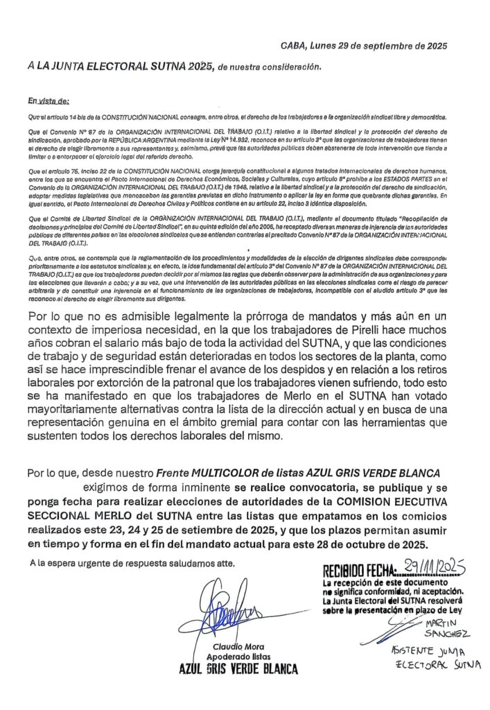 La elección en PIRELLI resultó empate en 167 votos entre el Frente Multicolor y la lista Negra. La Violeta obtuvo 119 votos y la Naranja 79. Vamos a una nueva elección entre el Frente Multicolor y la lista Negra para desempatar. El día 29/9 los compañeros del Frente Multicolor, junto al apoderado del mismo se presentaron ante la Junta Electoral en la sede central del SUTNA. No estaban presentes los integrantes de la Junta, pero si el asistente que les recibió la nota pidiendo en forma urgente fecha de las próximas elecciones. Los mandatos vencen el 28 de octubre de este año, y no se pueden prorrogar legalmente y estaría muy mal impedir las elecciones inmediatas en PIRELLI. La patronal de PIRELLI viene despidiendo compañeros y amenaza con seguir por ese camino.