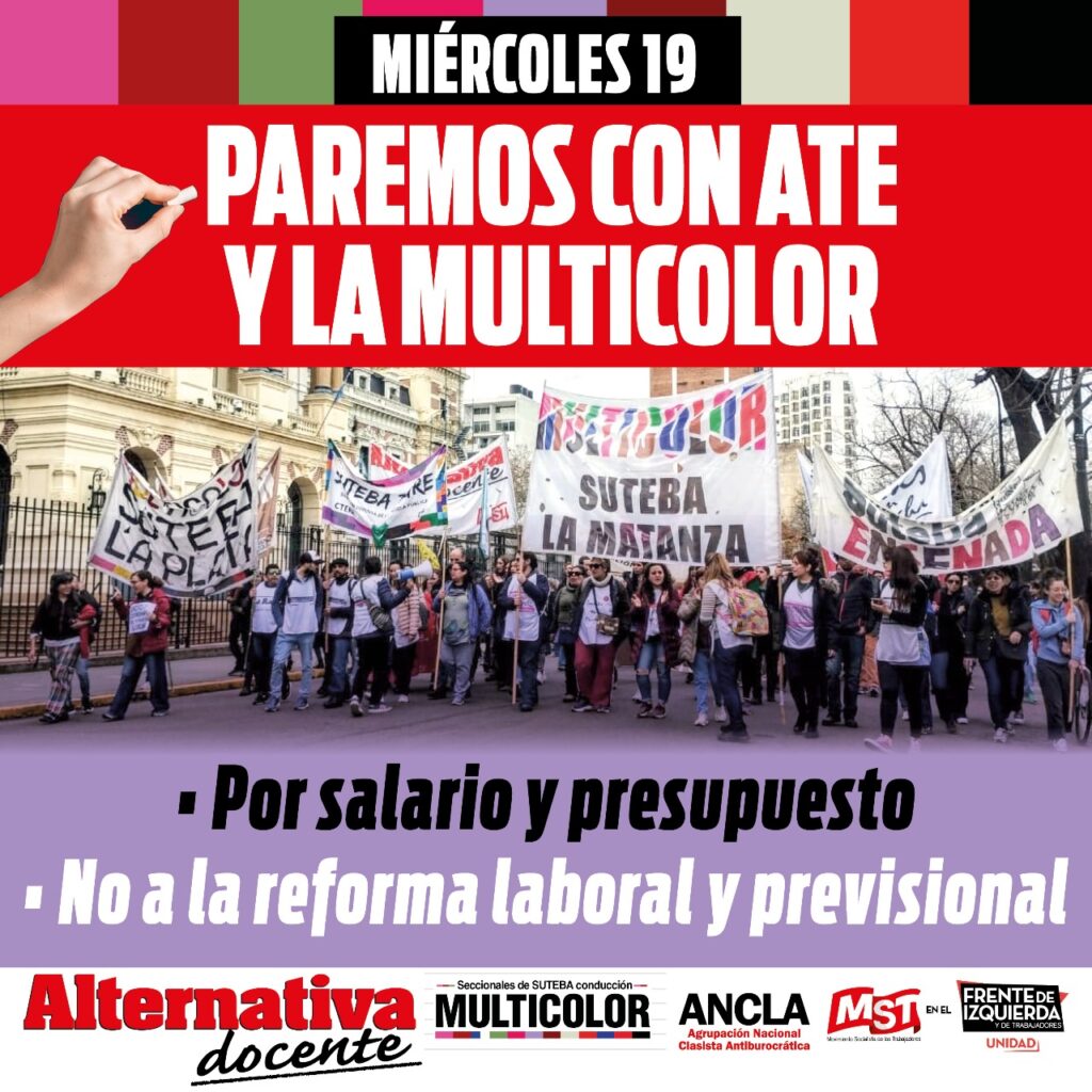 Por eso, en cada escuela, convoquemos a asambleas este martes 18 para votar la adhesión al paro de este miércoles 19 en unidad de acción con ATE y la Multicolor. Y el jueves 20, ante la demorada convocatoria a paritaria salarial docente, desde la Multicolor en La Plata llamamos a movilizar al ministerio de Trabajo.