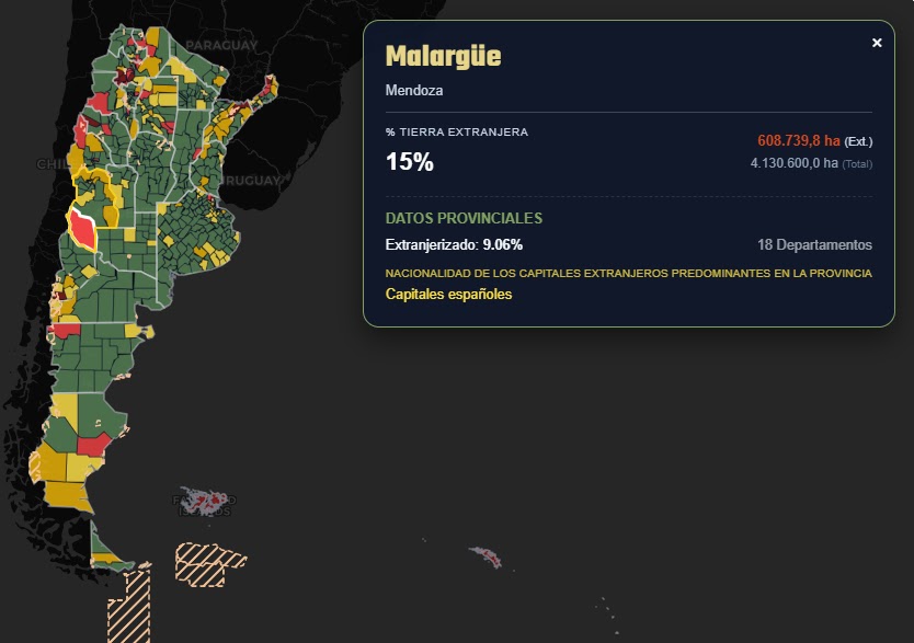 Por esta razón, como señala el informe, entre los datos oficiales de 2015 y 2022 “hubo una reducción del total de hectáreas registradas como extranjerizadas —de más de 15 millones a alrededor de 13 millones”. Esa reducción no se debe a una recuperación de tierras de manos extranjeras, sino a las modificaciones en la ley antes mencionada. Sin embargo, “a pesar de este deterioro de la calidad del dato público, podemos observar que en Mendoza y en Tierra del Fuego creció significativamente la extranjerización”.