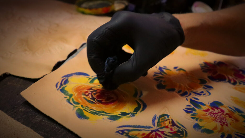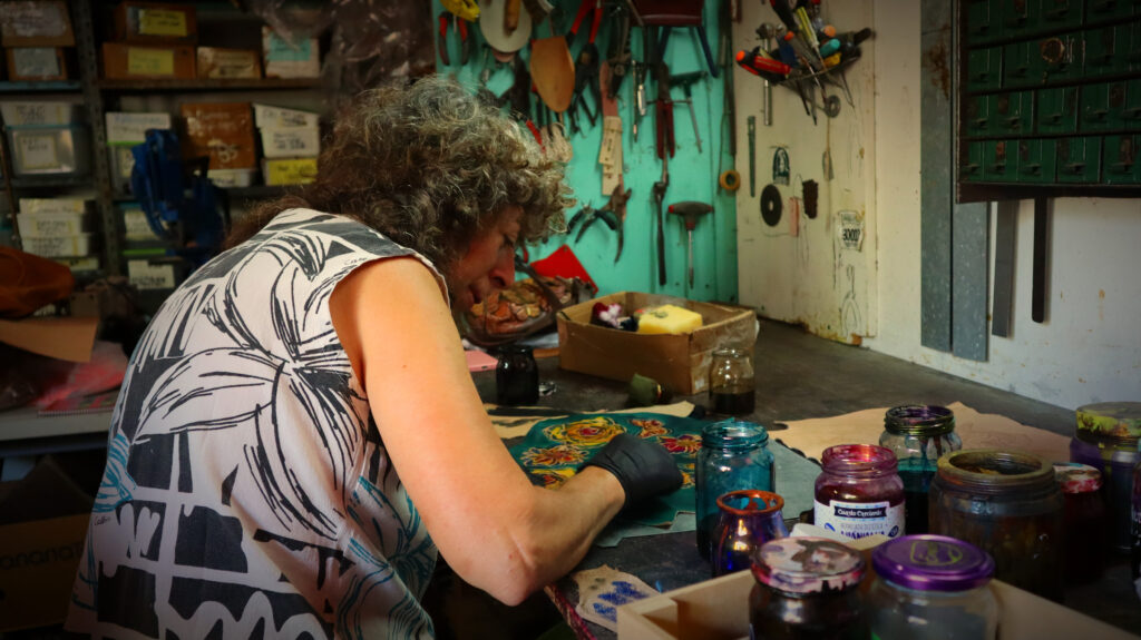 Nacida en Caballito, pero instalada desde hace cuarenta años en el sur del Gran Buenos Aires, el taller de Mónica es un lugar especial que huele a cuero. Los rayos de sol entran por las ventanas e iluminan las paredes, donde hay viejos moldes de cartón. En los estantes, frascos de tinturas esperan su turno. Las mesas de trabajo están llenas de vida, con apliques en forma de mariposas y flores. Por todos lados hay pequeños carteles que dicen “Son 30.000”.