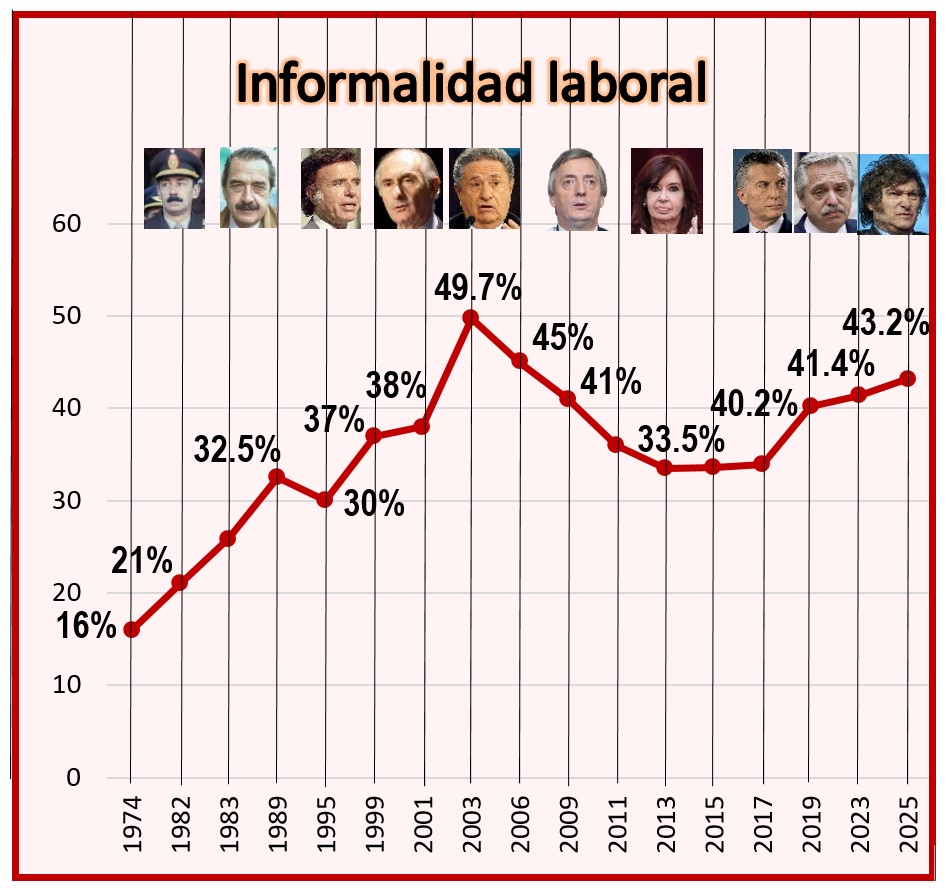 Así, después de dos años de reformas antiobreras, Milei tiene el segundo peor registro de los últimos 51 años, donde “los puestos de trabajo informales o ‘en negro’ y por cuenta propia siguieron en ascenso y ya representan el 50,6% de los puestos totales” (Clarín, 13/11). Con un nivel de informalidad solo superado por el estallido del 2001, incrementándola incluso en 2 puntos más, de cómo recibió su gobierno.
