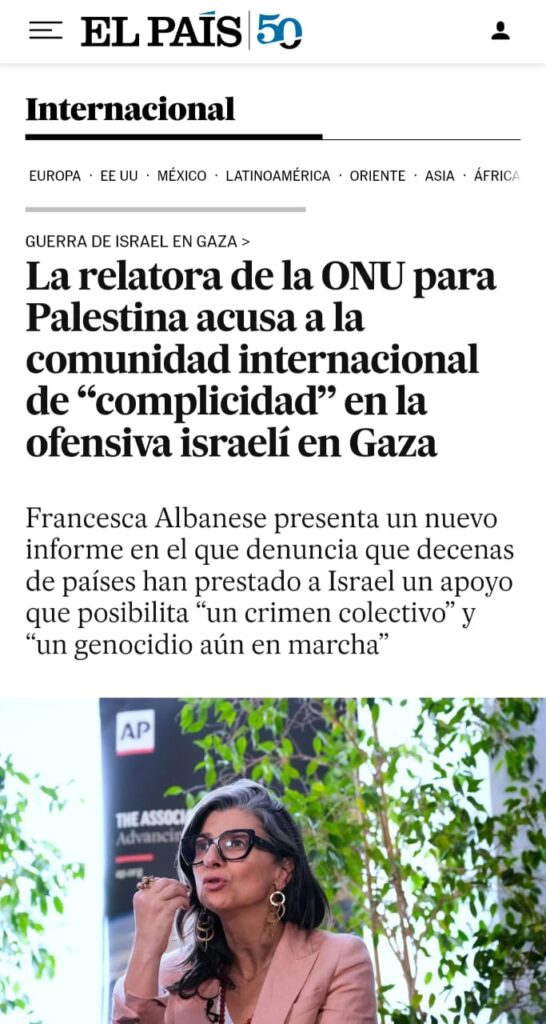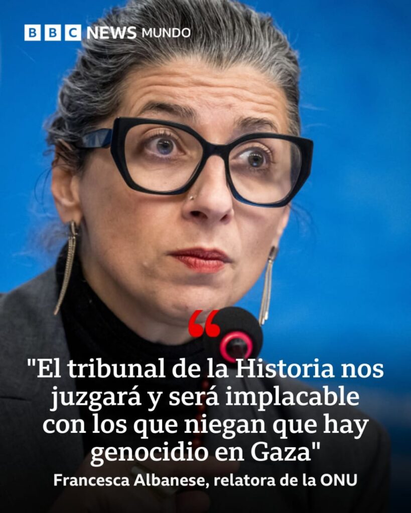 Esta posición contrasta de manera contundente con las denuncias reiteradas de Francesca Albanese, la Relatora Especial de la ONU sobre los derechos humanos en Palestina, quien en informes como Anatomía de un genocidio (Albanese, 2024) demuestra y fundamenta que no existe ninguna “guerra”, sino que se está perpetrando “el crimen de genocidio por parte del Estado de Israel”.