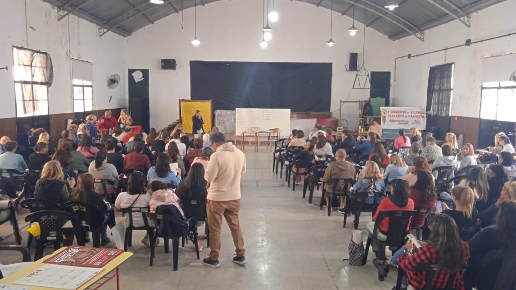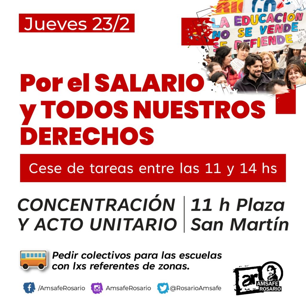 No habían pasado ni 40 minutos del final de la asamblea en Rosario que se hizo publica la convocatoria a reunión paritaria para el miércoles 22 al mediodía. De existir una propuesta serán convocadas reuniones en todos los departamentos para debatir las mociones que luego cada docente votara en sus escuelas. En Rosario nos preparamos con todo para nuevas asambleas y para impulsar una fuerte acción callejera el 23. Vamos por un salario igual a la canasta familiar con clausula gatillo para no seguir perdiendo. Presupuesto al 10% del PBI. Edificios en condiciones y material pedagógico. Dejar de pagar la deuda externa. Eliminar los millonarios subsidios a las iglesias y demás patronales privadas para destinarlos a la Pública.