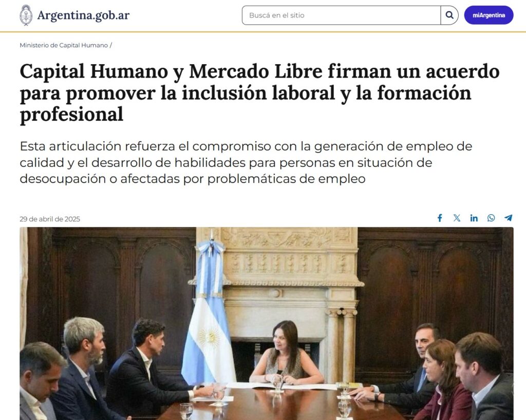 A su vez, el pasado 29 de abril, se había firmado un convenio entre la ministra y las autoridades de Mercado Libre para “promover la formación profesional y mejorar las condiciones de empleabilidad de personas desocupadas y beneficiarias de programas nacionales de empleo, provenientes del programa Volver al Trabajo”. Pero hasta la fecha no hay constancia de que ningún desocupado haya ingresado a Mercado Libre. Al contrario…