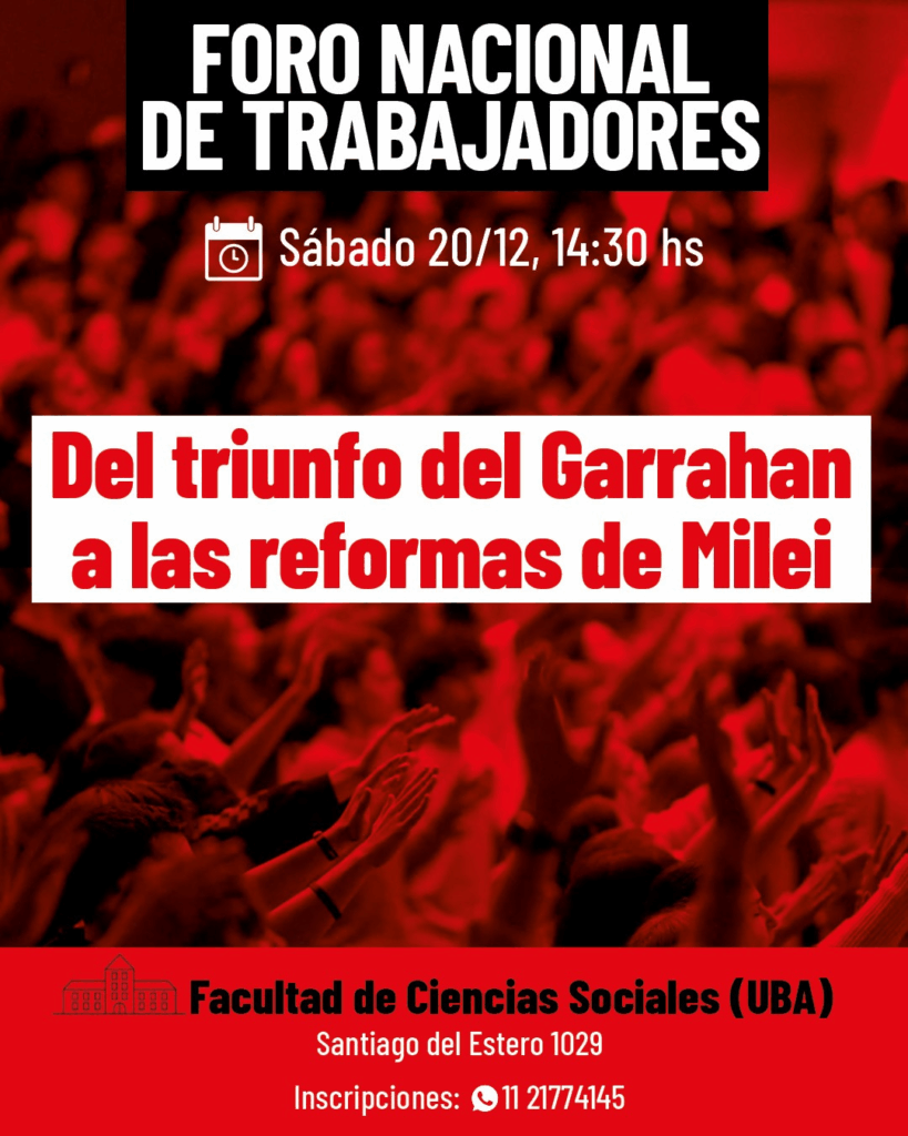 Para seguir profundizando en la naturaleza de la reforma y discutir cómo enfrentarla y derrotarla, te invitamos al Foro Nacional de Trabajadores este 20 de diciembre, a las 14:30hs, en la Facultad de Ciencias Sociales de la UBA si sos de Buenos Aires, o de forma virtual si estas en cualquier otro lugar del país. El panel contará con la participación destacada de Norma Lezana, Secretaria General de APyT y referenta de la histórica lucha de los y las trabajadoras del Hospital Garrahan. También participarán del panel abogados laboralistas de gran trayectoria, referentes de la lucha ambiental, de DD.HH. y Mariano Rosa, dirigente del MST en el Frente de Izquierda – Unidad. Te esperamos.