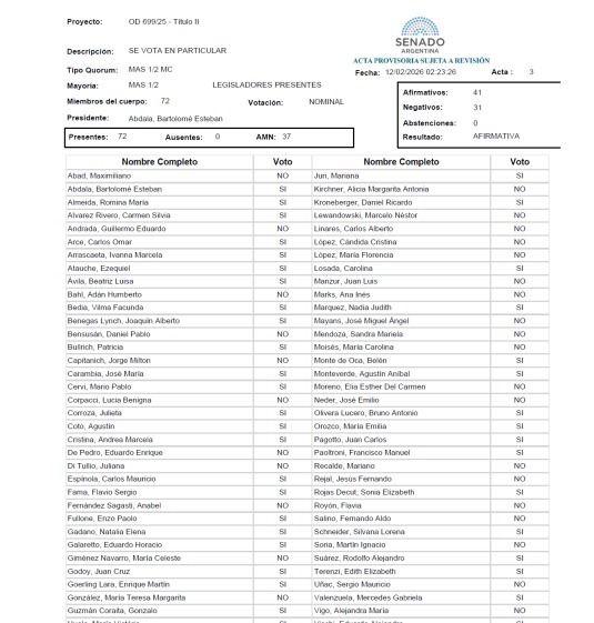 El Senado de la Nación dio media sanción al proyecto de contrarreforma laboral impulsado por el gobierno de Javier Milei, con 42 votos a favor y 30 en contra en la votación en general. Entre los votos negativos figuraron los de los senadores por Santa Cruz, José María Carambia y Natalia Gadano. Sin embargo, en el tratamiento en particular por capítulos, la actuación de ambos difirió y terminó facilitando la aprobación de puntos centrales del proyecto.