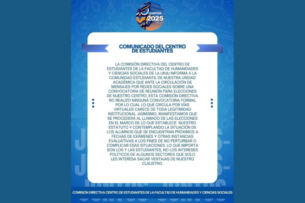 Tan solo minutos después de que se hiciera pública el acta que manifestaba el compromiso de todos los espacios estudiantiles de convocar a asamblea para llamar a elecciones, JUNTOS, la agrupación que usurpa ilegalmente la oficina y los títulos del Centro de Estudiantes, publicó un comunicado absurdo. Respondemos: