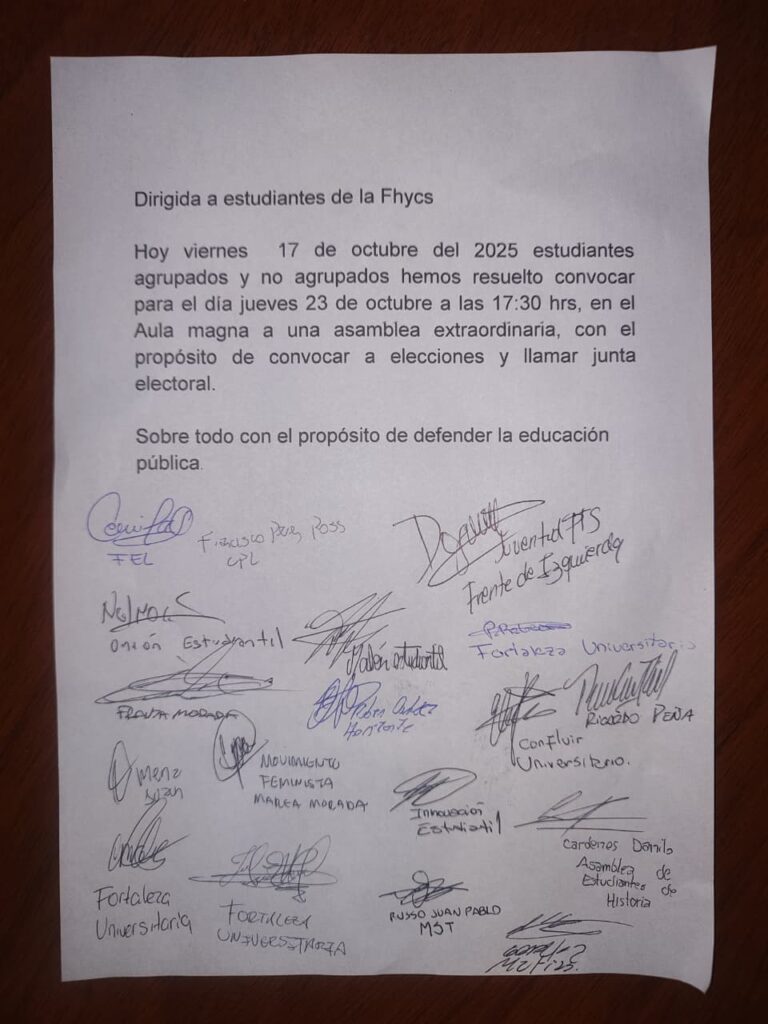 Estudiantes independientes, organizados en asamblea por carrera y la mayoría de agrupaciones estudiantiles de la FHyCS resolvimos convocar para el próximo jueves 23 de octubre a una asamblea extraordinaria que conforme la junta electoral y convoque a elecciones de centro de estudiantes. Se trata de un logro de la campaña que impulsamos desde la Juventud Socialista del MST junto a otros compañerxs, recolectando en pocas semanas más de 1000 firmas de estudiantes qué, a más de 6 años de la última elección y de que JUNTOS usurpara nuestra herramienta de representación, exigen que se convoqué a elecciones. Sobre la campaña, ver aquí.